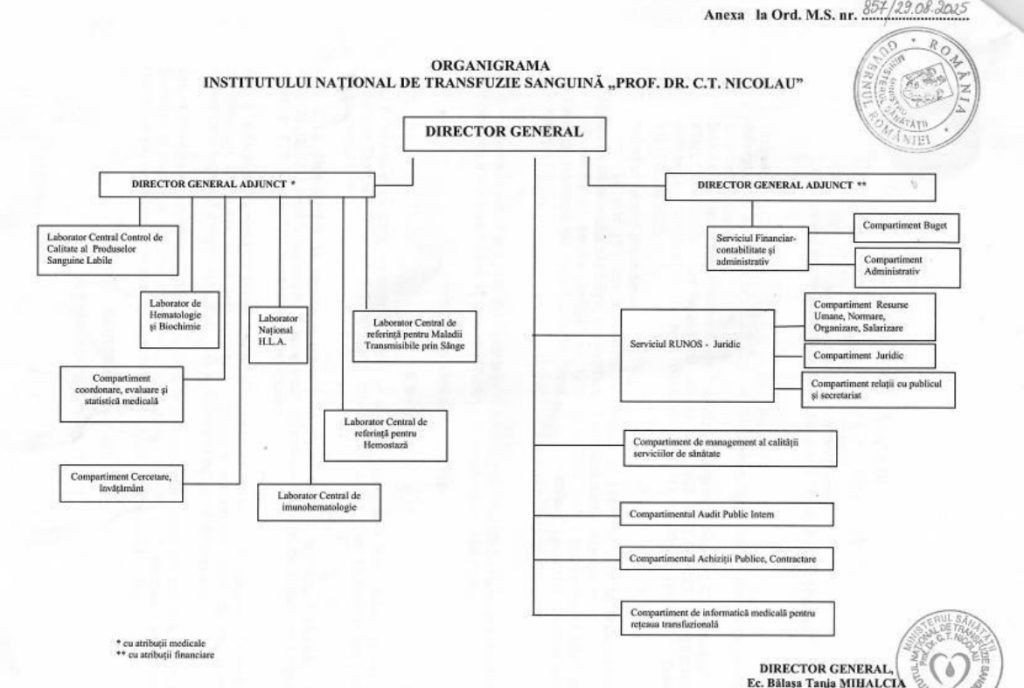 Institutul National de Transfuzie Sanguină ”Prof. Dr. C. T. Nicolau” Bucuresti este organizat şi funcționează în baza Legii Nr. 282 din 5 octombrie 2005 *** Republicată privind organizarea activităţii de transfuzie sanguină, donarea de sânge şi componente sanguine de origine umană, precum şi asigurarea calităţii şi securităţii sanitare, în vederea utilizării lor terapeutice , cu modificările şi completările ulterioare, care îi conferă personalitate juridică şi autoritate în domeniul transfuziei de sânge..